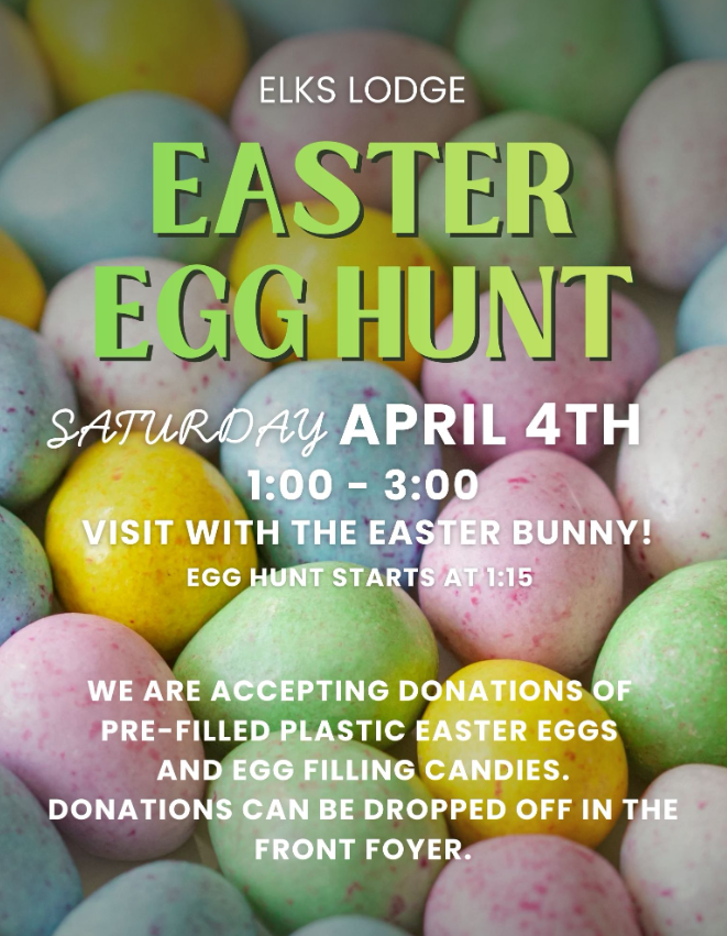 Easter Egg Hunt April 4, 2026 January 6, 2026March 17, 2026Add a comment Mark Your Calanders For Our Elks Lodge Easter Egg Hunt!!– Saturday, April 4th – 1:00pm – 3:00pm– Egg hunt will begin at 1:15pm– Visit with the Easter Bunny and real live bunny’s– Please sign up at the bar Share this: Share on X (Opens in new window) X Share on Facebook (Opens in new window) Facebook Like Loading... Related
